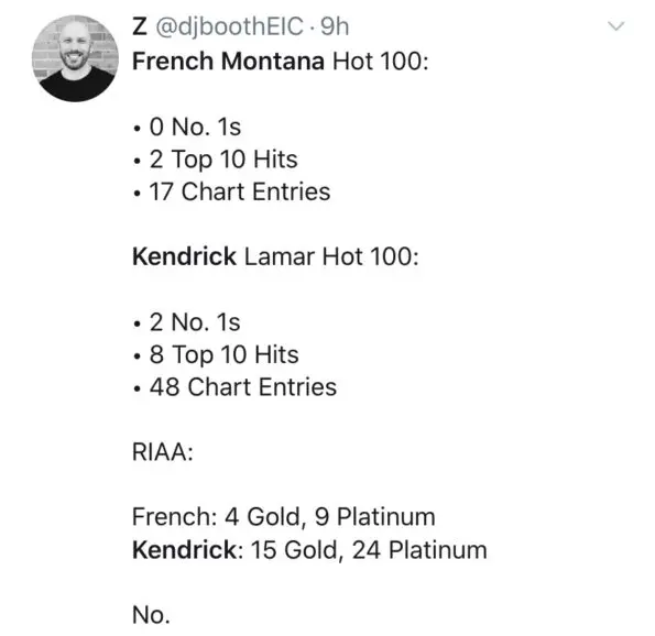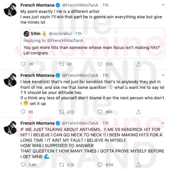 Here's the clip in question: French Montana says he has more hits than Kendrick Lamar.