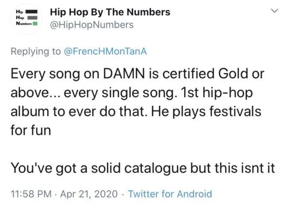 “IF WE JUST TALKING ABOUT ANTHEMS, !! ME VS KENDRICK HIT FOR HIT ! I BELIEVE I CAN GO NECK TO NECK !! I BEEN MAKING HITS FOR A LONG TIME ! IT AINT MY FAULT I BELIEVE IN MYSELF. HOW WAS I SUPPOSED TO ANSWER THAT QUESTION ? HOW MANY TIMES I GOTTA PROVE MYSELF BEFORE I GET MINE…not taking nothing away from him just standing for myself is that still cool ? lol”