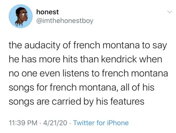 French Montana: I could go Hit vs Hit with Kendrick Lamar pic.twitter.com/tbsckizqsE— Jigjiga (@PrinceWalo) April 22, 2020