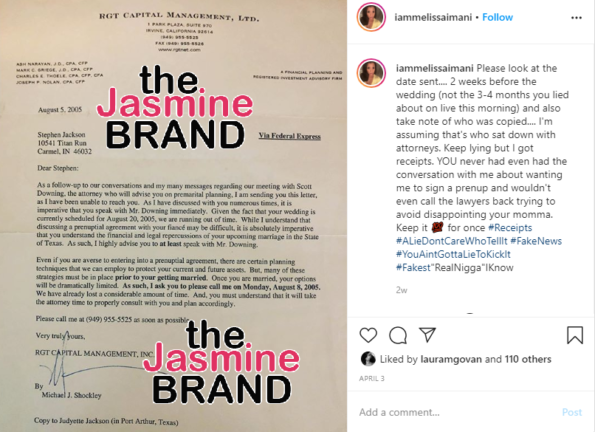 “Please look at the date sent…. 2 weeks before the wedding (not the 3-4 months you lied about on live this morning) and also take note of who was copied…. I’m assuming that’s who sat down with attorneys. Keep lying but I got receipts. YOU never had even had the conversation with me about wanting me to sign a prenup and wouldn’t even call the lawyers back trying to avoid disappointing your momma. Keep it 100 for once #Receipts #ALieDontCareWhoTellIt #FakeNews #YouAintGottaLieToKickIt #Fakest”RealN*gga”IKnow”