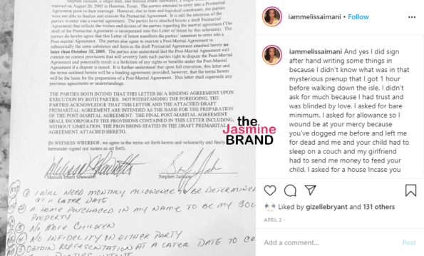 She, then, shared a copy of the prenup in which she wrote more stipulations in out of fear she and their daughter would go hungry again. Melissa’s caption read: