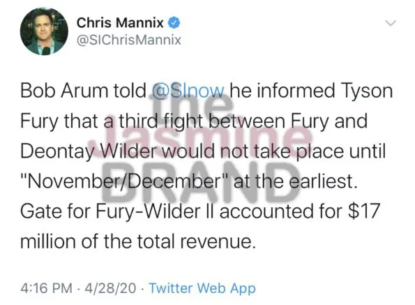 “You know, but looking at the fight, he knows that wasn’t me. I know that wasn’t me and the people in boxing, everyone knows that wasn’t the real Deontay Wilder. Something was wrong with him, and you know, we will show. Like I said, there’s a time and place for it all, and I’ll reveal a lot of things.”