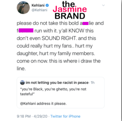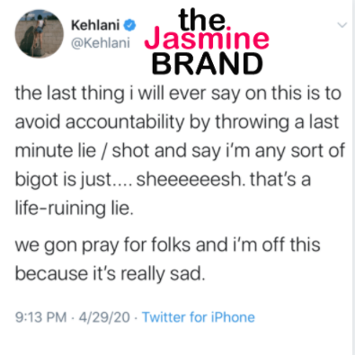 “…to avoid accountability by throwing a last minute lie / shot and say i’m any sort of bigot is just… sheeeeeeeesh…please do not take this bold a** lie and f*ckin run with it…this could really hurt my fans…my daughter…my family members…i respond to a hit on my head with love and i get slandered further…”