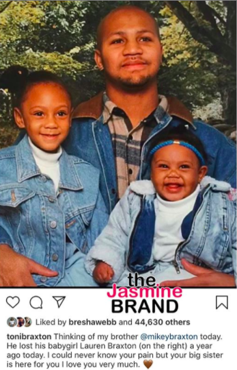 “Thinking of my brother @mikeybraxton today. He lost his babygirl Lauren Braxton (on the right) a year ago today. I could never know your pain but your big sister is here for you I love you very much.”