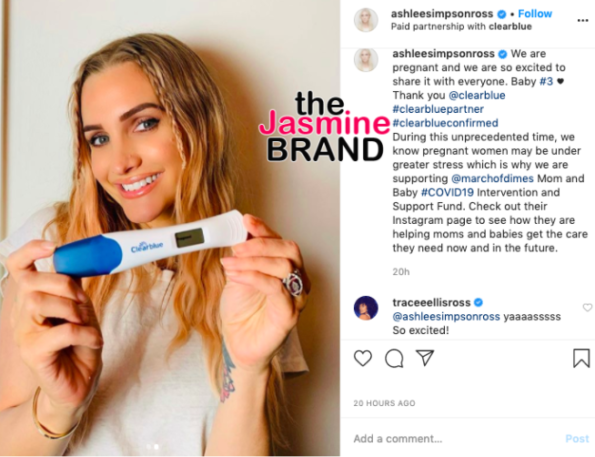 “We are pregnant and we are so excited to share it with everyone. Baby #3. Thank you @clearblue #clearbluepartner #clearblueconfimed During this unprecedented time, we know pregnant women may be under greater stress which is why we are supporting @marchofdimes Mom and Baby #COVID19 Intervention and Support Fund. Check out their Instagram page to see how they are helping moms and babies get the care they need now and in the future.”