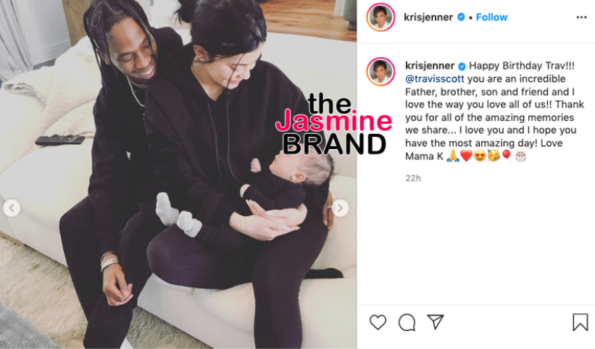 “Happy Birthday Trav!!! @travisscott you are an incredible Father, brother, son and friend and I love the way you love all of us!! Thank you for all of the amazing memories we share… I love you and I hope you have the most amazing day! Love Mama K”.