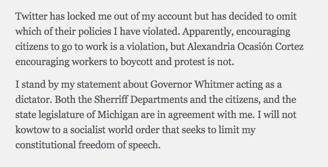 However, now the right-wing activist claims Twitter locked her out of her account after she tweeted to Michigan residents telling them to violate the state’s lockdown order.