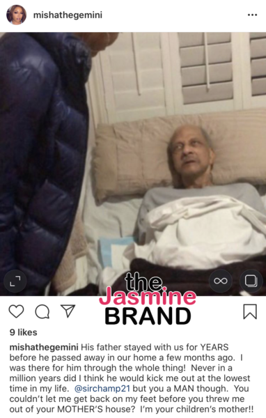 “His father stayed with us for YEARS before he passed away in our home a few months ago. I was there for him through the whole thing! Never in a million years did I think he would kick me out at the lowest time in my life. @sirchamp21 but you a MAN though. You couldn’t let me get back on my feet before you threw me out of your MOTHER’S house? I’m your children’s mother!!”