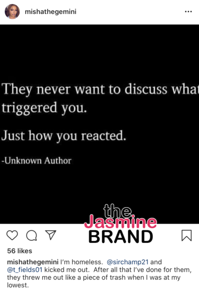 “I’m homeless. @sirchamp21 and @t_fields01 kicked me out. After all that I’ve done for them, they threw me out like a piece of trash when I was at my lowest.”
