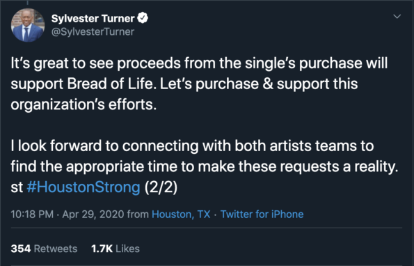 It’s great to see proceeds from the single’s purchase will support Bread of Life. Let’s purchase & support this organization’s efforts. I look forward to connecting with both artists teams to find the appropriate time to make these requests a reality. I appreciate my daughter, Ashley Turner, for encouraging and informing me about about the launch of the single and how the proceeds would benefit one of our local organizations who does great work. Her points were very persuasive.#BeyGood #TheeStallion #Savage”