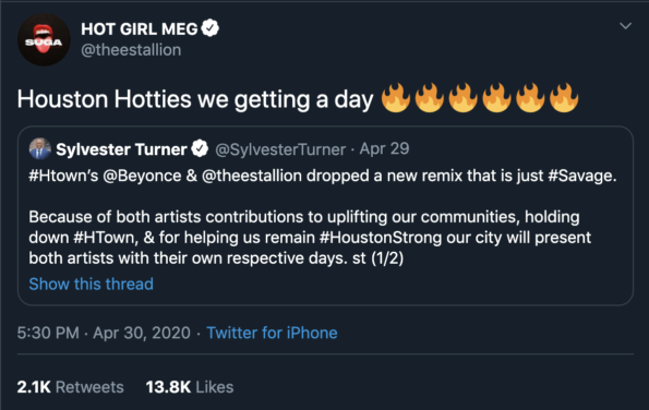 “#Htown’s @Beyonce &@theestallion dropped a new remix that is just #Savage. Because of both artists contributions to uplifting our communities, holding down #HTown, & for helping us remain #HoustonStrong our city will present both artists with their own respective days.”
