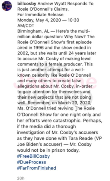 Birmingham, AL — Here’s the multi-million dollar question: Why Now? The Rosie O’Donnell Show’s first episode aired in 1996 and the show ended in 2002, but she waits until 24 years later to accuse Mr. Cosby of making lewd comments to a female producer. This is just another attempt for a well-known celebrity like Rosie O’Donnell and many others to create false allegations about Mr. Cosby, in-order to gain attention for themselves and their new projects that are not doing well. Remember, on March 23, 2020, Ms. O’Donnell tried reviving The Rosie O’Donnell Show for one night only and her efforts were catastrophic. Perhaps, if the media did a thorough investigation of Mr. Cosby’s accusers as they have done with Tara Reade (VP Joe Biden’s accuser) — Mr. Cosby would not be in prison today.