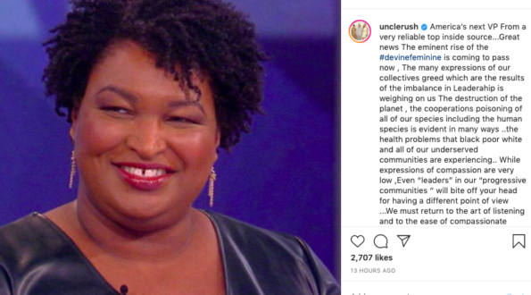 In a post on Instagram, entrepreneur, and hip-hop icon, Russell Simmons claims to have heard from a “reliable top inside source” that Stacey Abrams will be Joe Biden’s VP and even goes as far to openly congratulate her.