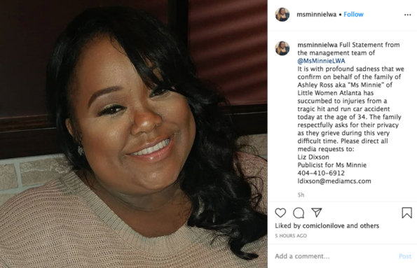 It is with profound sadness that we confirm on behalf of the family of Ashley Ross aka “Ms Minnie” of Little Women Atlanta has succumbed to injuries from a tragic hit and run car accident today at the age of 34. The family respectfully asks for their privacy as they grieve during this very difficult time.