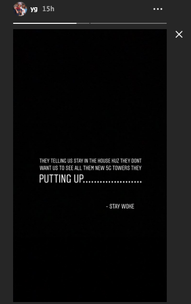 Fellow West Coast rap artist YG said he believes that the government is not sharing all information regarding 5G cell towers. He posted this on his Instagram Story on April 3rd: