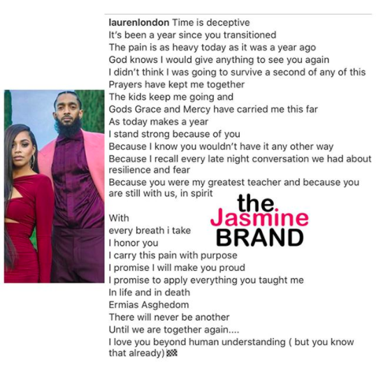 On March 31, Nispsey’s longtime girlfriend and actress Lauren London commemorated the one-year anniversary of his death. See the entire message below.