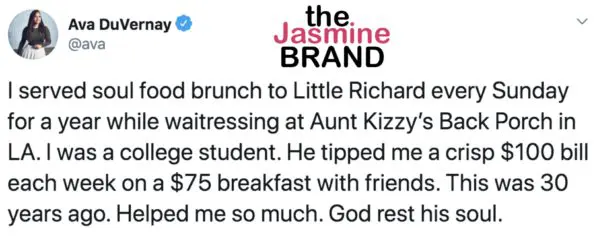 Filmmaker Ava DuVernay states that before she became a well-respected film distributor, she was a waitress for the late Little Richard. According to a tweet on Twitter, Ava DuVernay said this encounter occurred for a year, 3o years ago. While she worked at Aunt Kizzy’s Back Porch in Los Angeles, CA, Little Richard would make an appearance every Sunday. He would come in and order $75 worth of “soul food brunch” breakfast with friends. In return, Little Richard would gift Ava DuVernay with a “crisp $100 bill” each time. She was a college student at the time.