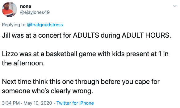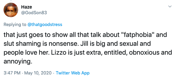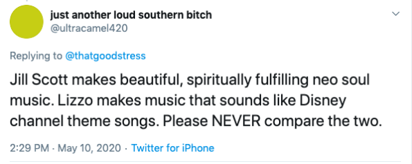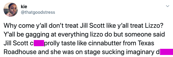 “Why come y’all don’t treat Jill Scott like y’all treat Lizzo? Y’all be gagging at everything lizzo do but someone said Jill Scott c*m prolly taste like cinnabutter from Texas Roadhouse and she was on stage sucking imaginary d*ck”