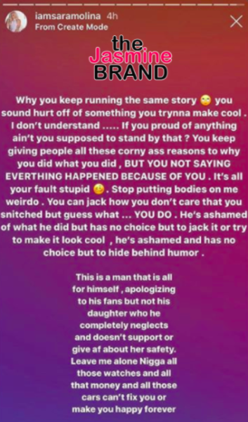 “You can jack how you don’t care that you snitched but guess what… YOU DO. He’s ashamed of what he did but has no choice but to jack it or try to make it look cool. He’s ashamed and has no choice but to hide behind humor, this is a man that is all for himself, apologizing to his fans but not his daughter who he completely neglects and doesn’t support or give af about her safety.”