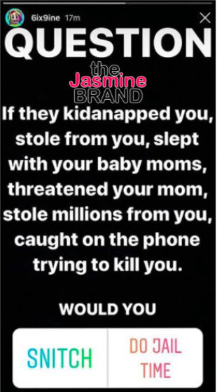 “QUESTION: If they kidnapped you, stole from you, slept with your baby moms, threatened your mom, stole millions from you, caught on the phone trying to kill you. Would you snitch or do jail time?”