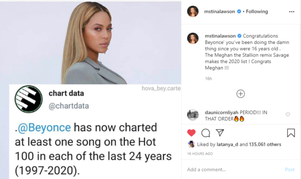 The Houston, Texas matriarch congratulated Beyonce for reaching this goal with the recent news of her single with rapper Megan Thee Stallion hitting #2 on the Billboard charts. Tina’s caption read: