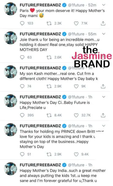 As previously reported, on Mother’s Day, Future thanked 6 of his baby mamas, not including two women who were rumored to have his children, (1 of which is Eliza Reign, now confirmed to be his child, Reign Wilburn’s mom).