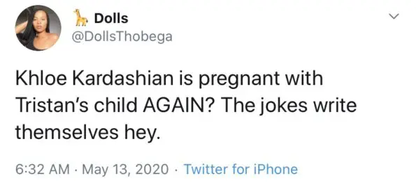 Original Story: Is Khloe Kardashian expecting? For reasons unknown, Twitter has collectively conspired that the reality TV star is not only pregnant but that the father is her daughter, True‘s, father – Cleveland Cavaliers player, Tristan Thompson. On an April episode of Keeping Up With the Kardashians, Tristan Thompson and Khloe Kardashian hinted that there could be a possibility that they’d welcome another child together:
