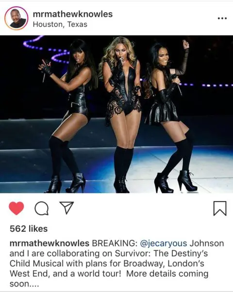 Meanwhile, he announced that a Destiny’s Child musical was in the works last year.
