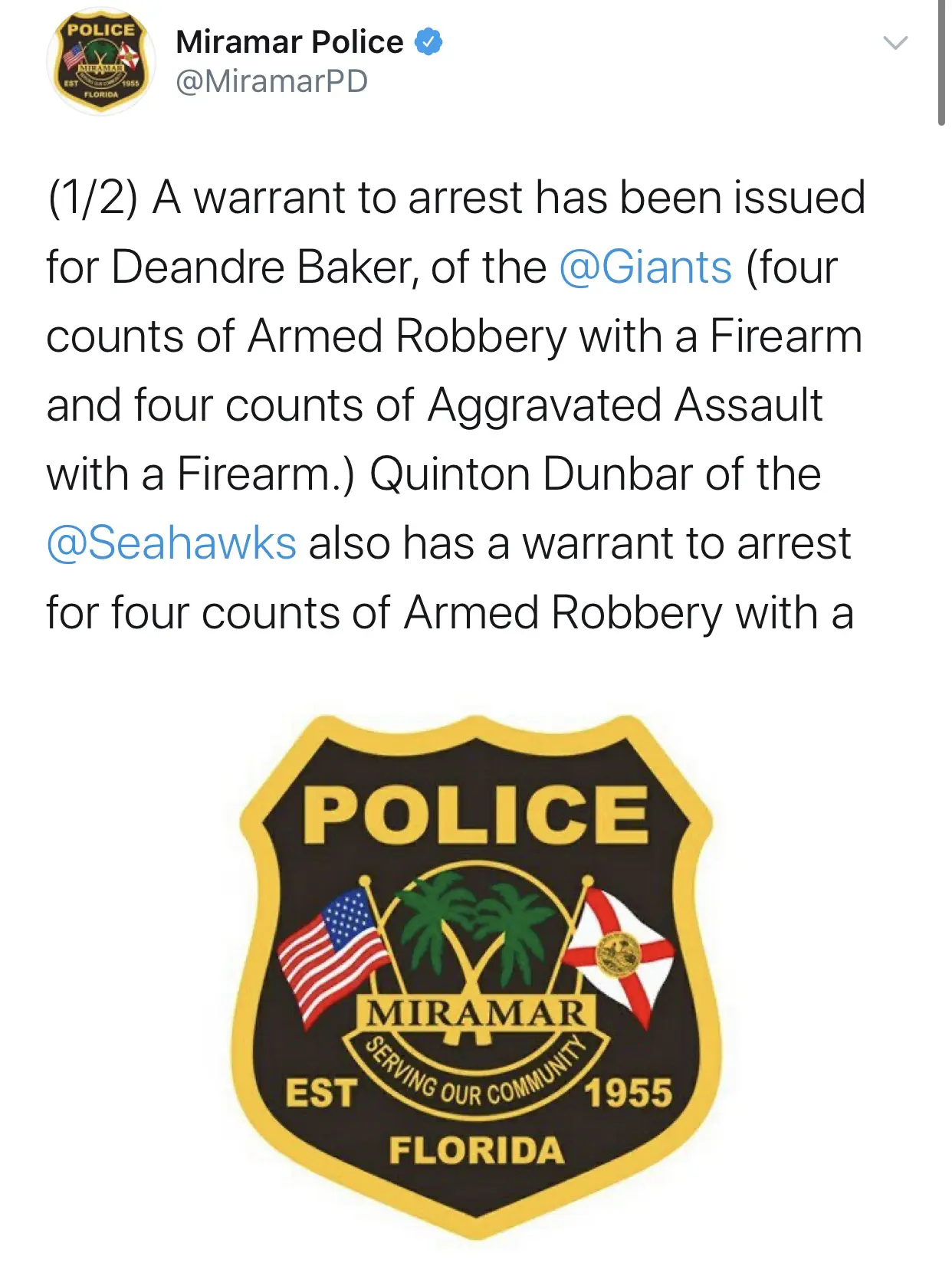 New York Giants’ Deandre Baker and Seattle Seahawks’ Quinton Dunbar have reportedly been issued an arrest warrant regarding an incident that occurred on Wednesday (May 13th), in Miramar County, Florida. According to multiple reports, Deandre Baker, a recent first-round NFL draft pick by the New York Giants, along with Seattle Seahawks cornerback, Quinton Dunbar are being charged with four counts of armed robbery with a firearm and four counts of aggravated assault with a firearm. The Miramar Police Department tweeted the news Friday (May 15th).