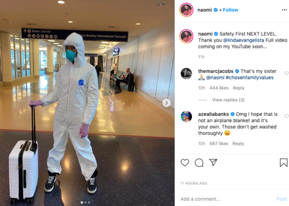 Former model Naomi Campbell is not one to play with germs. She gave her Instagram followers a look at how she is keeping safe during the coronavirus pandemic. She posted a selfie with the caption,