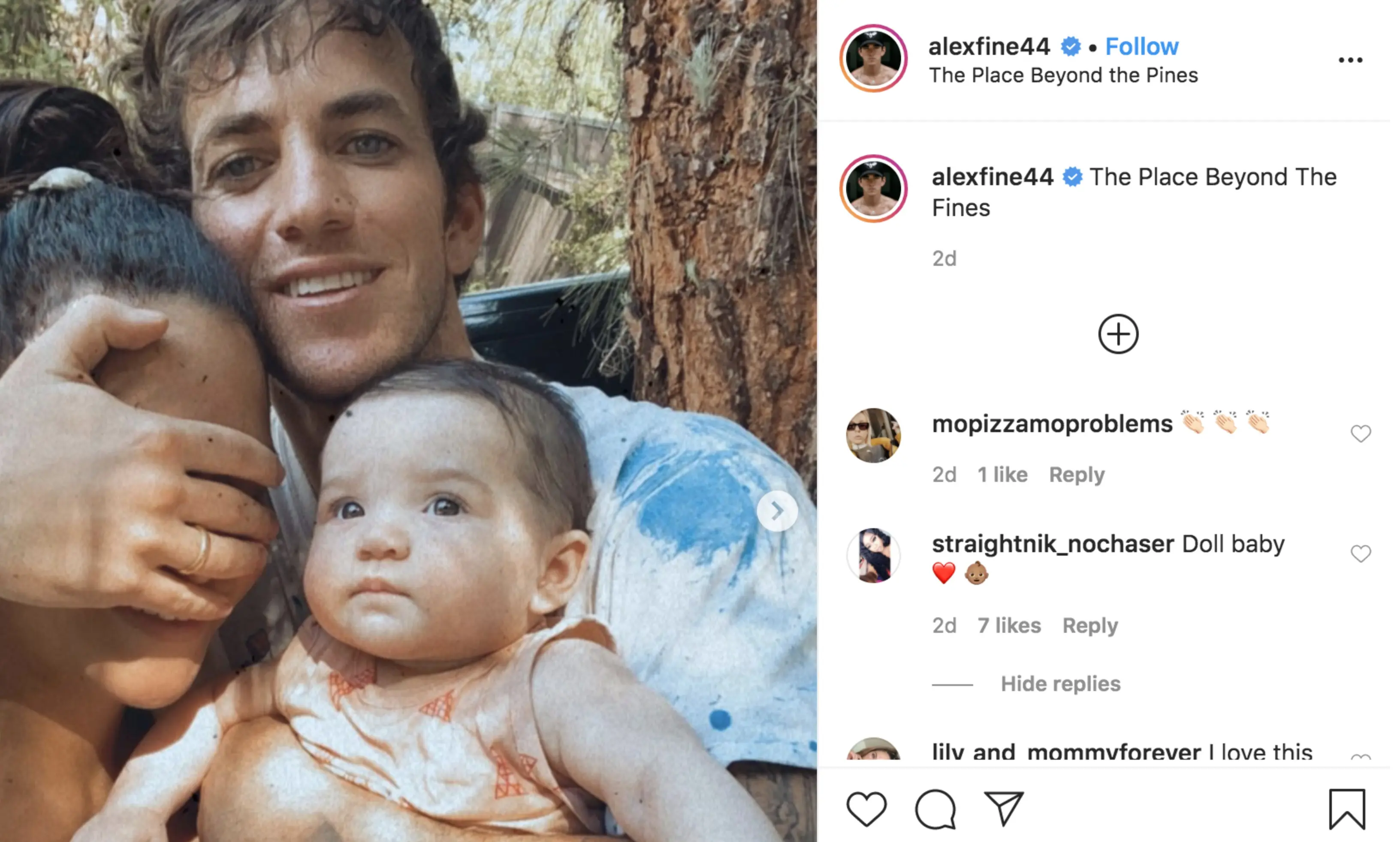 Earlier this month, Alex Fine shared an adorable picture of himself, wife Cassie, and baby Frankie Fine, channeling the 2013 film The Place Beyond The Pines, on Instagram.