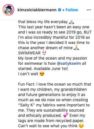 This last year hasn’t been an easy one and I was so ready to see 2019 go, BUT I’m also incredibly thankful for 2019 as this is the year I decided it was time to chase another dream of mine SWIMWEAR My love of the ocean and my passion for swimwear is how [Salty K Swim] all started. Available June 1st!I can’t wait. Fun Fact: I love the ocean so much that I want my children, my grandchildren and future generations to enjoy it as much as we do now so when creating “Salty K” my fabrics were important to me. They are sustainability sourced and ethically produced. Even my tags are made from recycled paper. Can’t wait to see what you think”