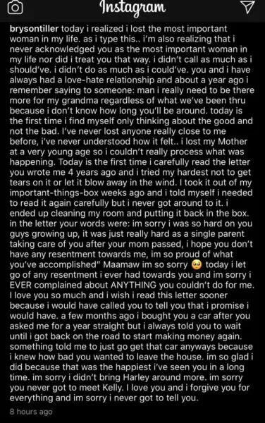 Singer Bryson Tiller was only four-years-old when he lost his mother. He was then raised by his grandmother, who passed away last month. Bryson Tiller recently took to social media to tell his fans, that when his “Maamaw” died, all of his self-doubt went away as well,