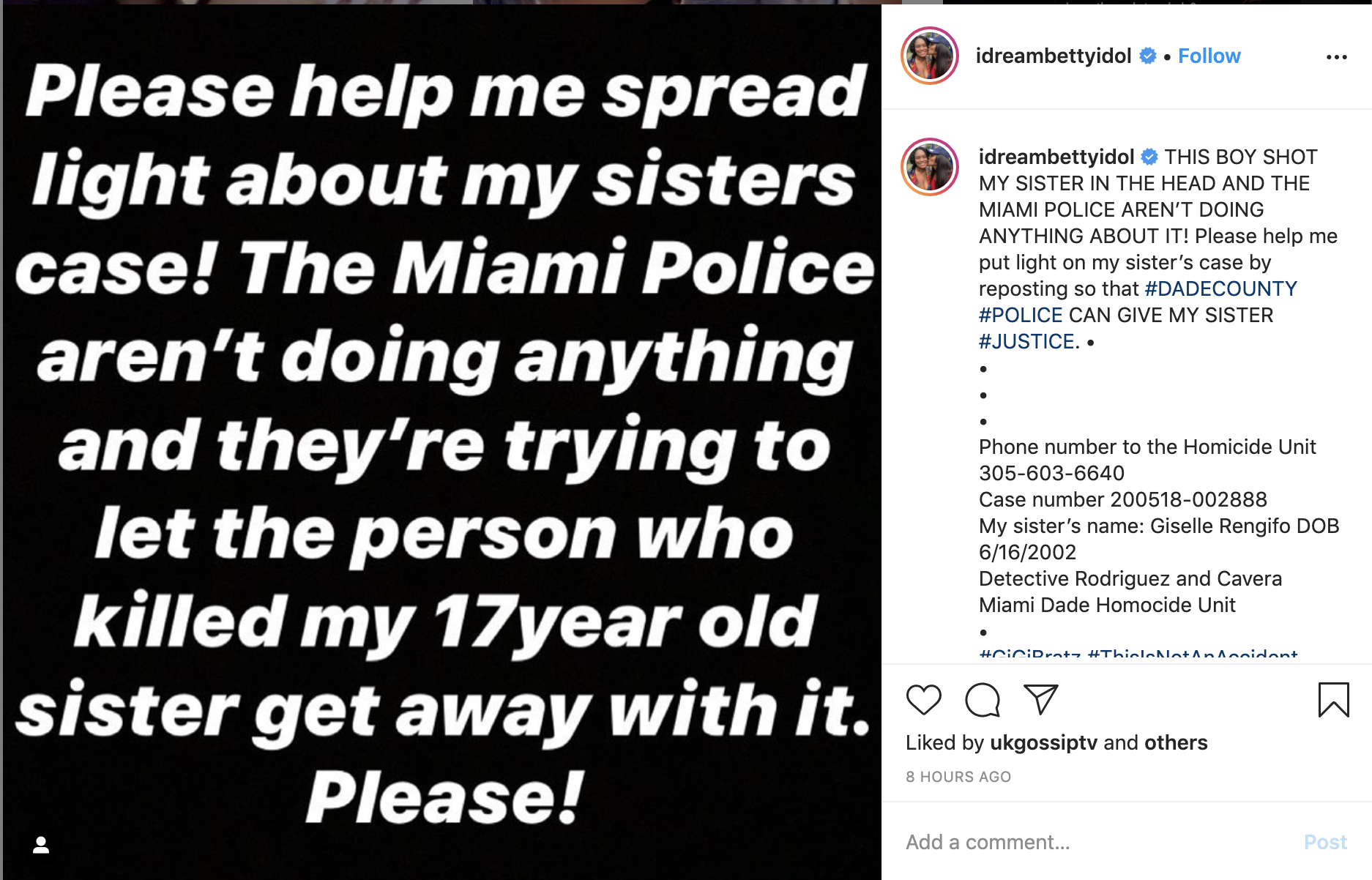 Betty Idol and her family have repeatedly contacted the South Miami police department to get more details and provide proof that the murder was NOT accidental, however, they have not received a response as of yet. Betty has kept everyone updated on the case on her instagram page posting alleged snapchats that the alleged killer posted before the killing. Betty has also shared snapchats of the alleged killer and his friends playing with a loaded gun.