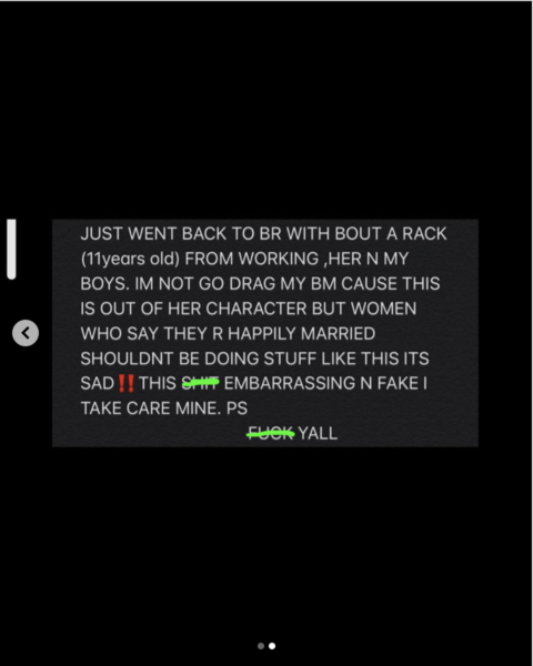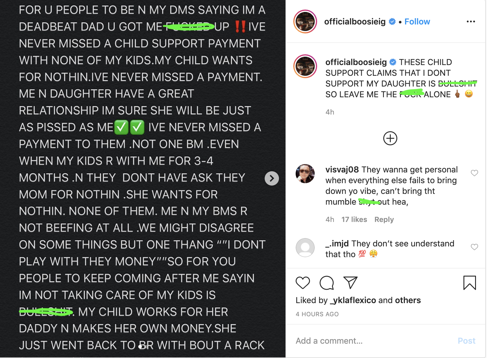 “For u people to be n my dms saying i’m a deadbeat dad u got me f****d up. Ive never missed a child support payment with none of my kids. My child wants for nothing. Ive never missed a payment. Me n daughter have a great relationship i’m sure she will be just as pissed as me. Ive never missed a payment to them. Not one bm. Even when my kids r with me for 3-4 months. n they don’t have ask they mom for nothing. She wants for nothing. None of them. Me n my bms r not beefing at all. We might disagree on some things but one thang “I don’t play with they money” So for you people to keep coming after me saying i’m not taking care of my kids is bulls**t. My child works for her daddy n makes her own money. She just went back to BR [Baton Rouge, La] with bout a rack (11 years old) from working, her n my boys. I’m not go drag my bm cause this is out of her character but women who say they r happily married shouldn’t be doing stuff like this its sad. This s**t embarrassing n fake I take care mine. PS F**k Y’all.”