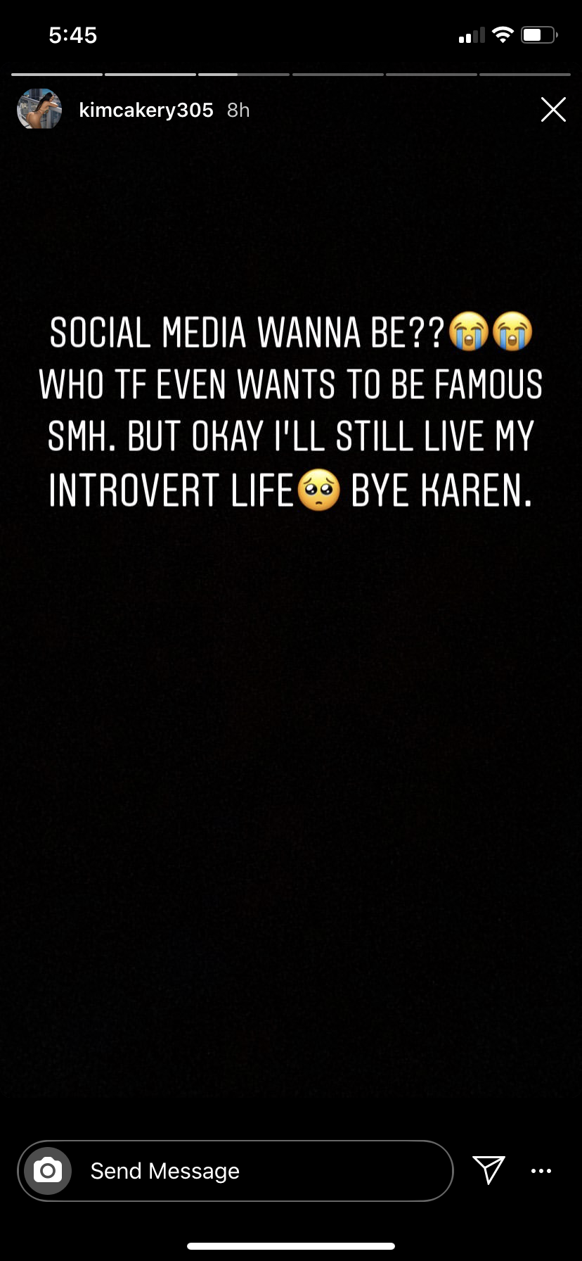 “Social media wannabe?? Who tf even wants to be famous smh. But okay i’ll still live my introvert life. Bye Karen.”