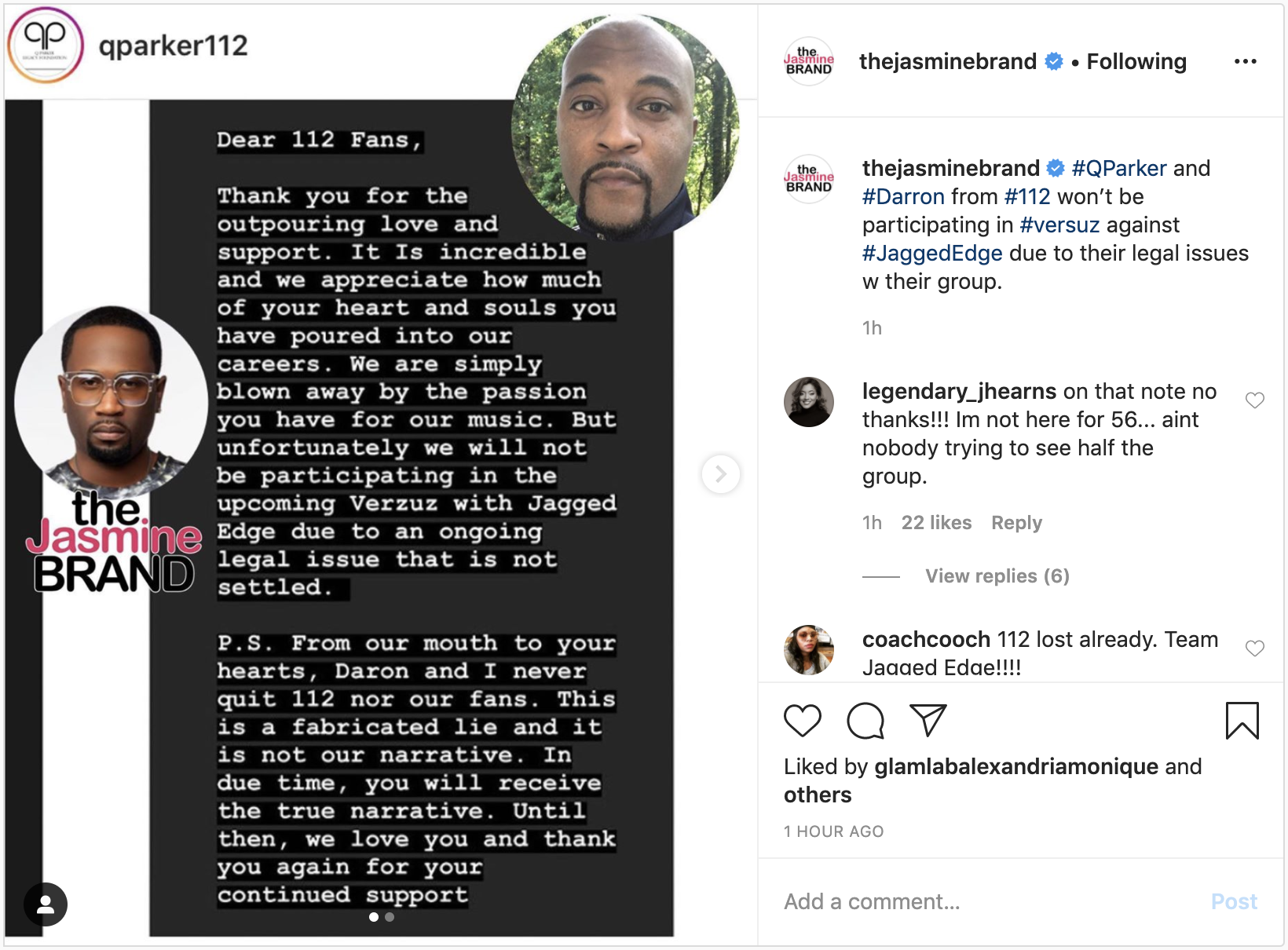 P.S. from our mouth to your hearts, Darron and I never quit 112 nor our fans. This is a fabricated lie and it is not our narrative. In due time you will receive the true narrative. Until then, we love you and thank you again for your continued support.”