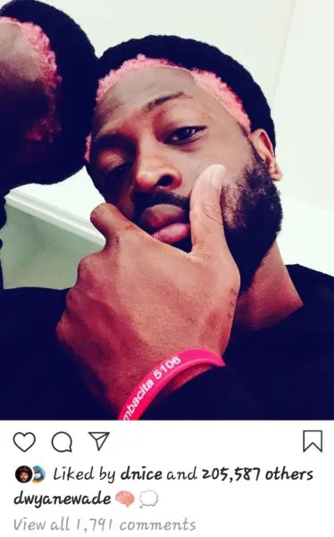 Dwyane Wade decided to switch up his look and has dyed his hair pink! In the pic, he tagged celebrity hairstylist Larry Sims just under his new pink hairline, who just happens to be his wife actress Gabrielle Union-Wade‘s hairstylist! The former Miami Heat point guard posted the selfie with only a pink brain emoji and a white comment bubble emoji in the caption: