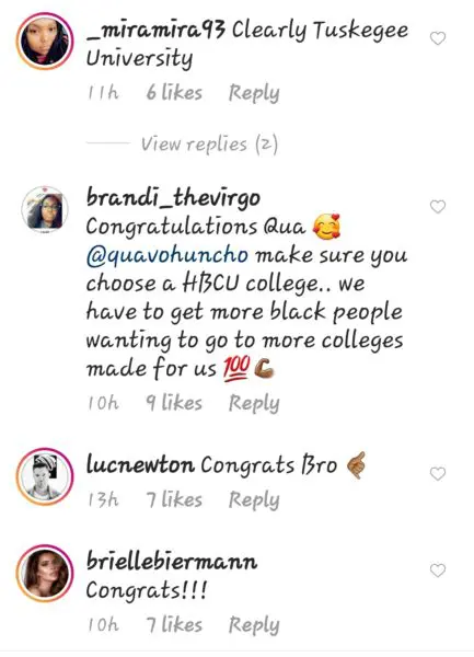 The 29-year-old dropped out of high school to pursue his music career full time and was a star football quarterback prior to doing so. It looks likeQuavo, whose real name is Quavious Marshall, has used the time away from performances due to the global coronavirus pandemic wisely to wrap up his high school career. Quavo may continue his education by attending college! Here are some of the suggestions to his question about what college he should go to as well as congratulatory messages from fans and celebrities: