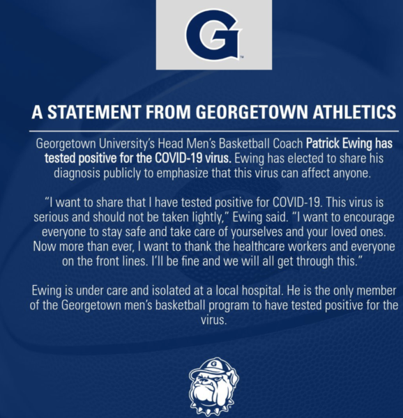Georgetown Coach and New York Knicks legend Patrick Ewing has tested positive for the coronavirus. This announcement came from Georgetown and Patrick Ewing also posted the announcement on his personal Twitter account.
