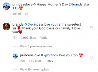 Unfortunately, it looks like things didn’t work out as she filed for divorce on May 7. Still, all might be well between Princess Love and Ray J’s family. She and Ray J’s sister, Grammy-award winning singer Brandy had a special moment on social media shortly just days after Princess’s filing.