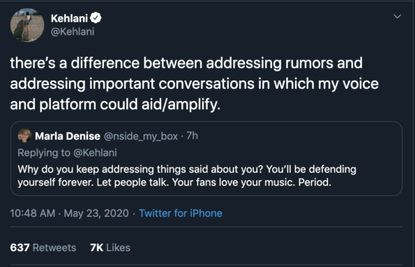 “there’s a difference between addressing rumors and addressing important conversations in which my voice and platform could aid/amplify.”