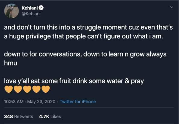 “and don’t turn this into a struggle moment cuz even that’s a huge privilege that people can’t figure out what i am. down to for conversations, down to learn n grow always hmu love y’all eat some fruit drink some water & pray”