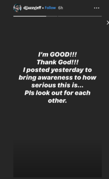 DJ Jazzy Jeff also took to his IG Stories to share the news and to warn the public to be safe.
