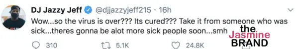 DJ Jazzy Jeff is no stranger to being extremely ill during this pandemic. On April 15, the 55-year-old DJ revealed during a video with his long-time friend Will Smith that he had become sick with what he believed to be the coronavirus. After a recent trip, he claimed that he had double-pneumonia, with symptoms similar to that of a COVID-19 patient.
