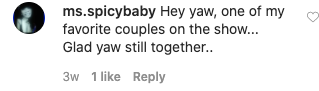 “Hey yaw, one of my favorite couples on the show…Glad yaw still together..”