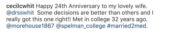 “Happy 24th Anniversary to my lovely wife. @drsswhit Some decisions are better than others and I really got this one right!! Met in college 32 years ago. @morehouse1867@spelman_college#married2med.”