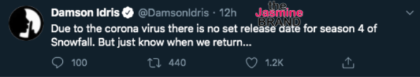 “Due to the corona virus there is no set release date for season 4 of Snowfall. But. just know when we return….”