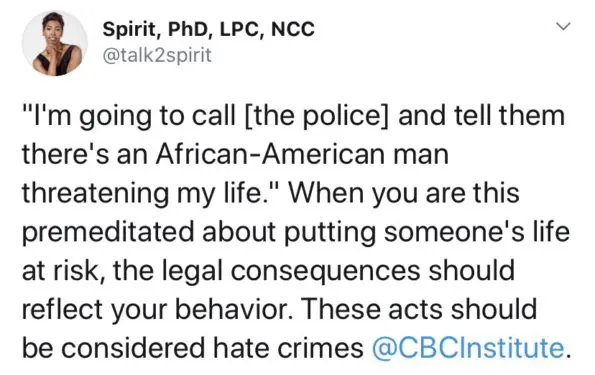 “I’m going to tell them there’s an African American man threatening my life…I’m sorry, I’m in the Ramble, and there’s a man, African-American, with a bicycle helmet. He is recording me, and threatening me and my dog…I’m sorry I can’t hear you. I’m being threatened by a man in The Ramble. Please send the cops immediately.”