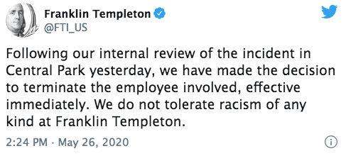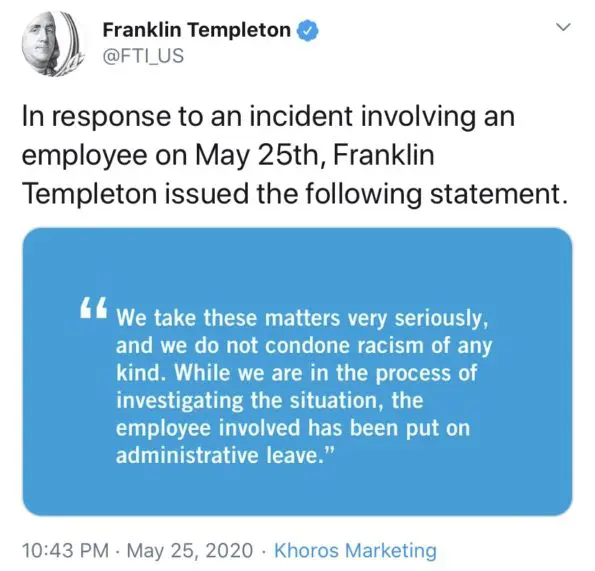 Her employer, Franklin Templeton, immediately held her accountable for. The firm’s Twitter statement read: